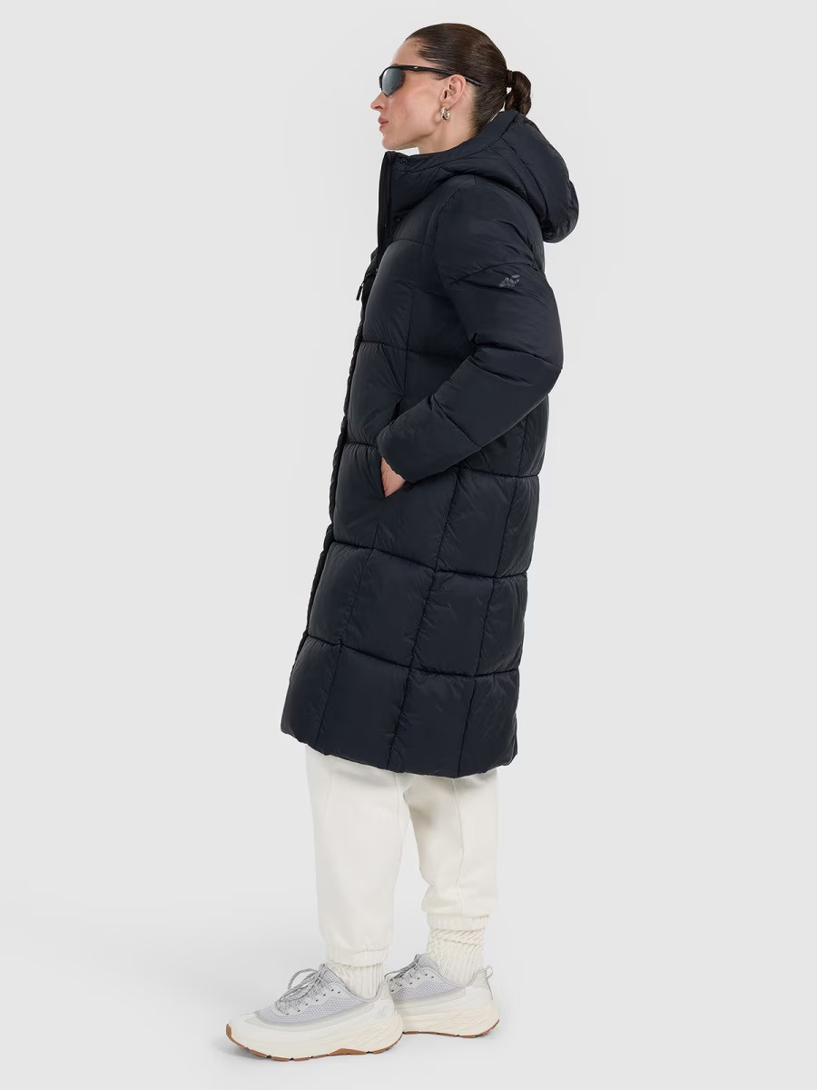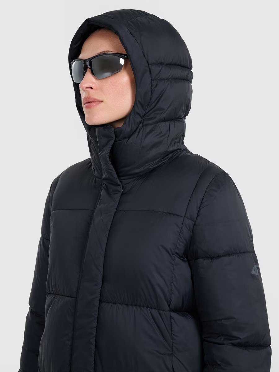 Płaszcz damski puchowy 4F z kapturem 4FWAW25TDJAF586 czarny