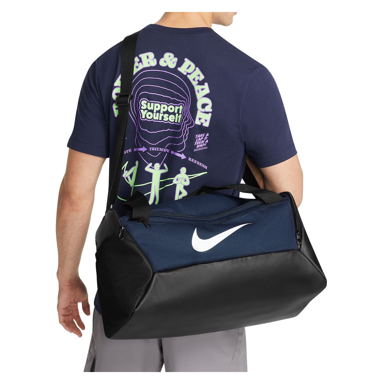 Doskonała na siłownię albo krótkie wyjazdy - torba Brasilia 9.5. Marka Nike zadbała o wysoką funkcjonalność modelu. Pojemna komora główna pomieści większy ekwipunek, a boczne przegrody pomogą uporządkować drobiazgi. Zamki błyskawiczne zabezpieczą zawartość przed wypadnięciem. Solidne uchwyty i regulowany pasek pozwolą na wygodne przenoszenie całości. Dzięki wykorzystaniu trwałego materiału, torba jest wytrzymała i posłuży przez wiele sezonów. Aby podkreślić sportowy charakter modelu, przód ozdobiono pokaźnym logo Swoosh.
